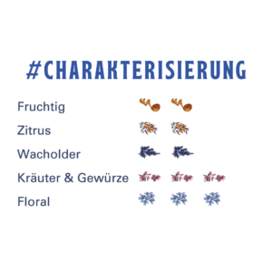 Floral: 2 von 4, Fruchtig: 1 von 4, Kräuter & Gewürze: 2 von 4, Wacholder: 4 von 4, Zitrus: 2 von 4