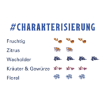 Floral: 3 von 4, Fruchtig: 3 von 4, Kräuter & Gewürze: 3 von 4, Wacholder: 4 von 4, Zitrus: 2 von 4