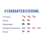 Floral: 2 von 4, Fruchtig: 3 von 4, Kräuter & Gewürze: 4 von 4, Wacholder: 2 von 4, Zitrus: 2 von 4
