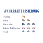 Floral: 3 von 4, Fruchtig: 1 von 4, Kräuter & Gewürze: 3 von 4, Wacholder: 3 von 4, Zitrus: 2 von 4